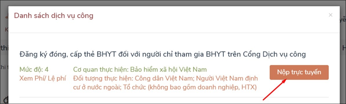 Chọn DVC Đăng ký đóng, cấp thẻ BHYT đối với người chỉ tham gia BHYT trên Cổng dịch vụ công và Chọn “Nộp trực tuyến”.