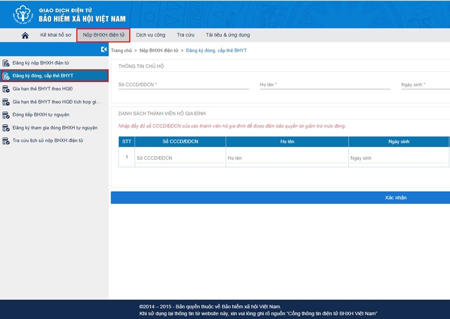 Bước 4. Cổng DVC quốc gia sẽ điều hướng sang Cổng DVC BHXH Việt Nam để người tham gia thực hiện kê khai, nộp hồ sơ đăng ký đóng, cấp thẻ BHYT đối với người chỉ tham gia BHYT.