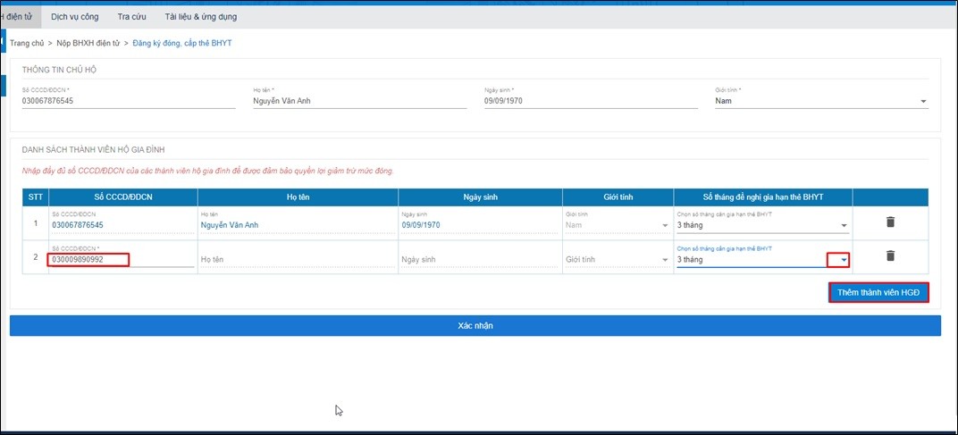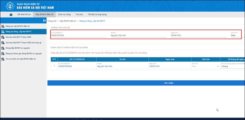 Sau khi kê khai đầy đủ các thành viên hộ gia đình, lựa chọn số tháng đăng ký, đóng BHYT, nhấn "Xác nhận". Hệ thống sẽ xác thực thông tin các thành viên hộ gia đình với Cơ sở dữ liệu quốc gia về dân cư: