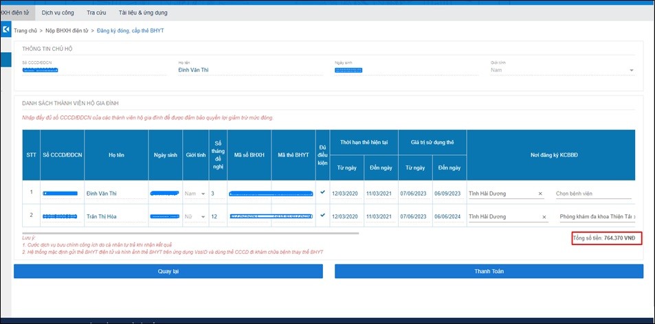 - Trường hợp cần bổ sung thành viên hộ gia đình hoặc điều chỉnh số tháng đăng ký, đóng BHYT, nhấn chọn "Quay lại" để thực hiện. Trường hợp các thông tin đã chính xác, nhấn chọn "Thanh toán" để tiếp tục, màn hình hiển thị như sau: