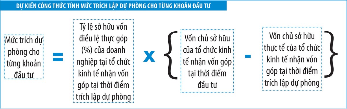 Theo đó, Bộ Tài chính dự kiến bổ sung hướng dẫn, với trường hợp chứng khoán đã niêm yết trên thị trường mà không có giao dịch trong vòng 30 ngày trước ngày trích lập dự phòng, thì doanh nghiệp xác định mức trích dự phòng cho từng khoản đầu tư chứng khoán theo nguyên tắc: căn cứ báo cáo tài chính riêng của tổ chức kinh tế nhận vốn góp lập cùng thời điểm lập báo cáo tài chính năm của doanh nghiệp góp vốn, doanh nghiệp góp vốn xác định mức trích dự phòng cho từng khoản đầu tư theo công thức sau (xem hình).