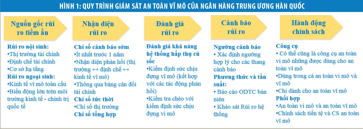 Ngân hàng Trung ương Hàn Quốc thực hiện giám sát an toàn vĩ mô theo quy trình: xác định nguồn gốc rủi ro; nhận diện rủi ro; đánh giá rủi ro; cảnh báo rủi ro; hành động chính sách (xem hình 1).