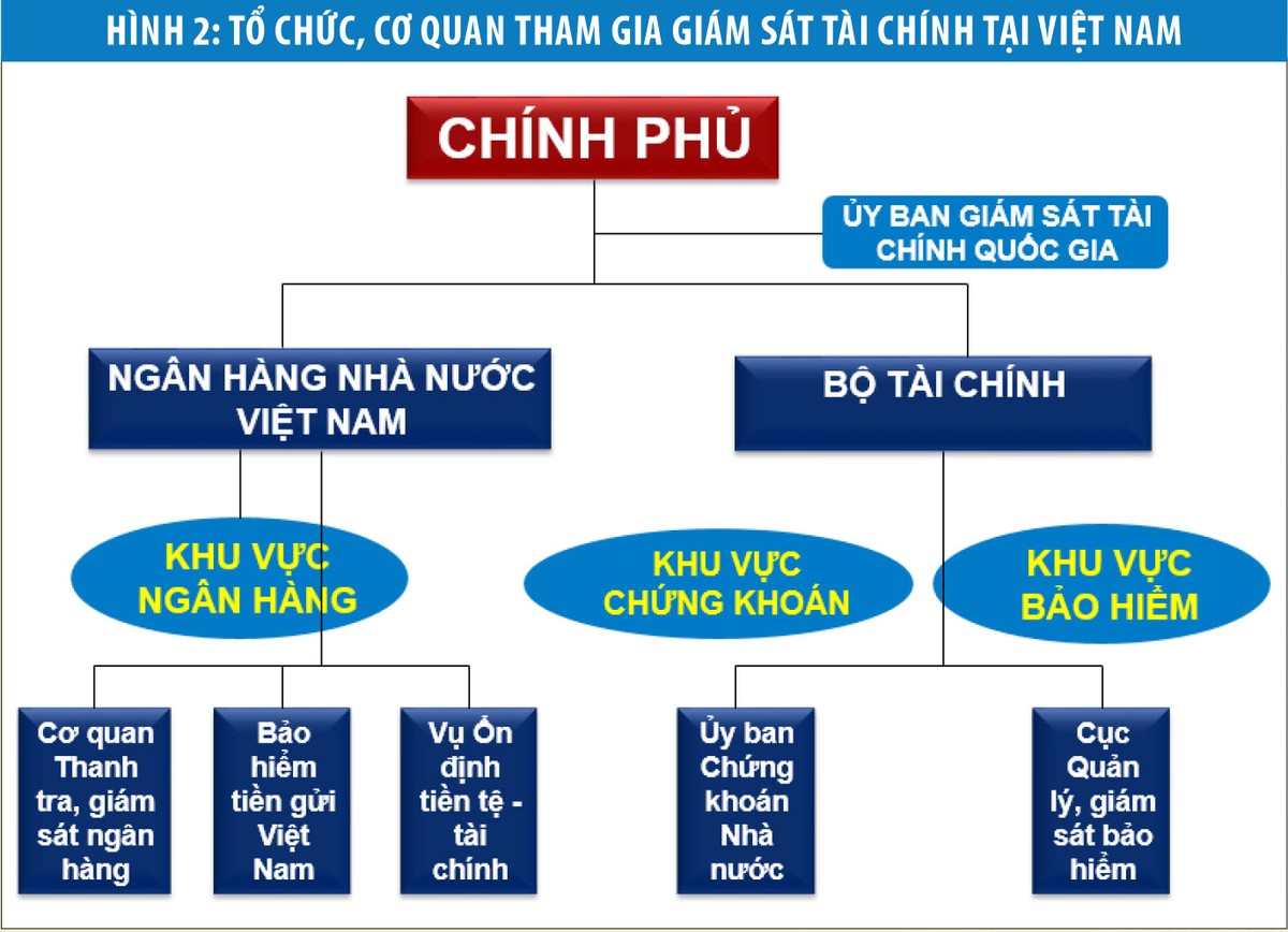 Công tác giám sát an toàn vĩ mô đối với hệ thống tài chính Việt Nam liên quan đến nhiều cơ quan (xem hình 2). Trong đó, Ngân hàng Nhà nước giám sát hệ thống các tổ chức tín dụng, Bộ Tài chính giám sát khu vực chứng khoán và bảo hiểm. Như vậy, mỗi cơ quan chỉ tập trung vào giám sát chuyên ngành riêng của mình và không thực hiện giám sát hợp nhất các tập đoàn tài chính.