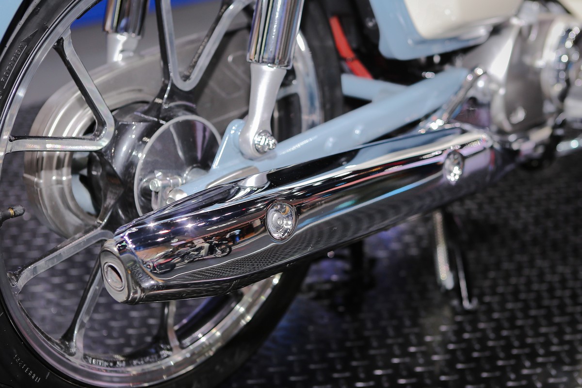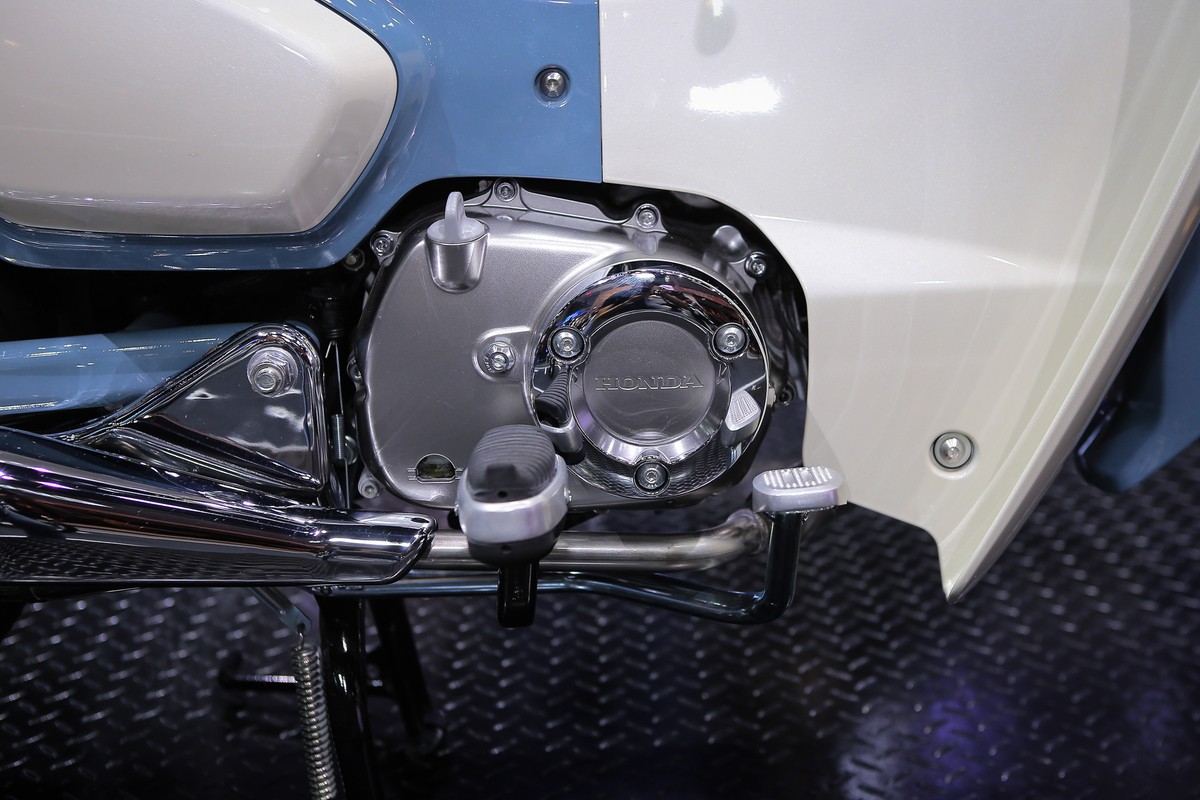 Ống xả mạ crôm thiết kế hình quả nhót. Super Cub C125 trang bị động cơ 125 phân khối, phun xăng điện tử. Hộp số 4 cấp.