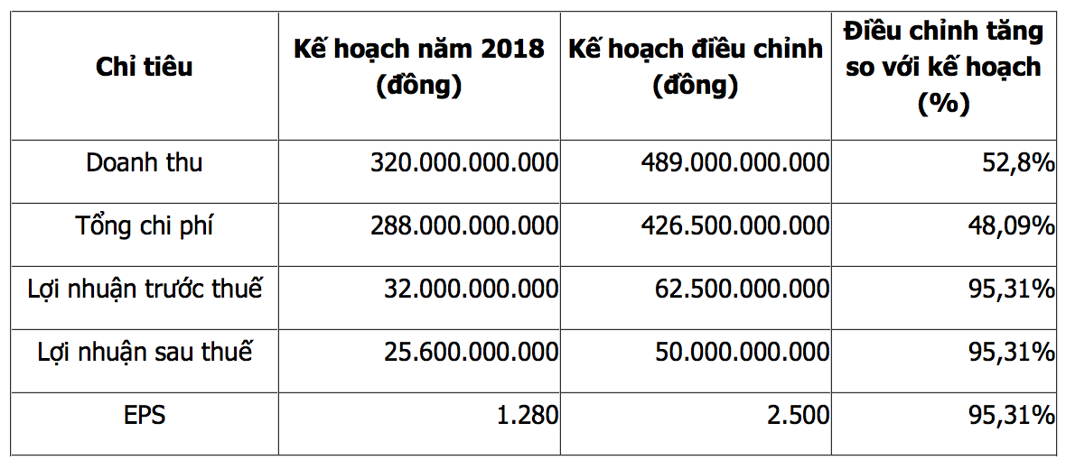 Cụ thể, doanh thu điều chỉnh tăng 52,8% so với kế hoạch được thông qua tại ĐHĐCĐ thường niên năm 2018, lên 489 tỷ đồng; lợi nhuận sau thuế điều chỉnh tăng 95,31%, lên 50 tỷ đồng.
