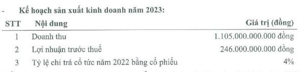 Ngoài ra, Đại hội cũng đã thông qua phương án chi trả cổ tức năm 2022 bằng cổ phiếu với tỷ lệ phát hành 4%. Tỷ lệ thực quyền 100:4 (mỗi cổ đông sở hữu 100 cổ phiếu sẽ được nhận 4 cổ phiếu mới). Tổng số lượng cổ phiếu phát hành thêm dự kiến tối đa không quá 16,2 triệu cổ phiếu. Tổng giá trị phát hành theo mệnh giá tối đa không quá hơn 162,2 tỷ đồng. Thời gian phát hành dự kiến năm 2023-2024 sau khi được UBCKNN chấp thuận.