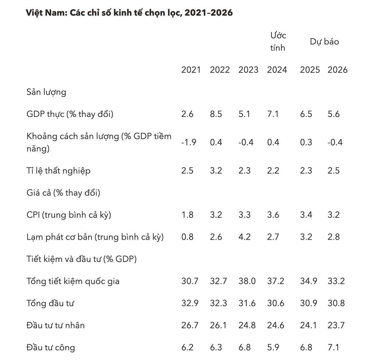 IMF nhận định, kinh tế Việt Nam đã bật trở lại mạnh mẽ trong năm 2024, đạt mức tăng trưởng 7,1% nhờ xuất khẩu mạnh, vốn đầu tư trực tiếp nước ngoài có sức chống chịu cao và các chính sách mang tính hỗ trợ. Đà tăng trưởng này tiếp tục trong nửa đầu năm 2025, với hoạt động kinh tế tăng 7,5% (so cùng kỳ năm trước) nhờ vào việc đẩy mạnh xuất khẩu sớm, tăng trưởng tín dụng nhanh hơn và khoản chi tiêu lớn phát sinh một lần của chính phủ. Lạm phát có tăng nhanh hơn một chút trong những tháng gần đây, tại thời điểm tháng 6/2025 đạt 3,6% so cùng kỳ năm trước, song vẫn ở dưới mức mục tiêu. Cán cân vãng lai thặng dư ở mức kỷ lục 6,6% GDP trong năm 2024.