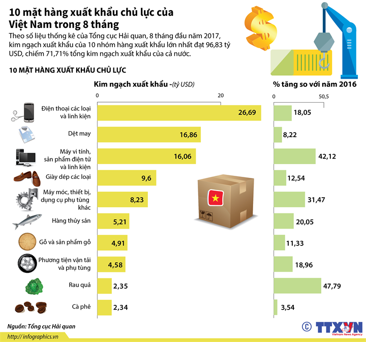 Theo số liệu thống kê của Tổng cục Hải quan, 8 tháng đầu năm 2017, kim ngạch xuất khẩu của 10 nhóm hàng xuất khẩu lớn nhất đạt 96,83 tỷ USD, chiếm 71,71% tổng kim ngạch xuất khẩu của cả nước.