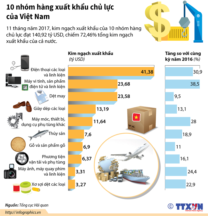 Theo TTXVN Tin liên quan [Infographic] Xuất khẩu gỗ có thể đạt 8 tỷ USD năm 2017 25/10/2017 09:55 [Infographic] Năm 2017, kim ngạch xuất khẩu dệt may ước đạt 31 tỷ USD 13/12/2017 10:12 [Infographic] Ngành mía đường đối mặt nhiều khó khăn 20/11/2017 10:55 [Infographic] Doanh thu thương mại điện tử dự báo đạt 10 tỷ USD vào năm 2020 05/10/2017 10:07 Từ khóa Infographic kim ngạch xuất khẩu 10 nhóm hàng xuất khẩu chủ lực xuất khẩu