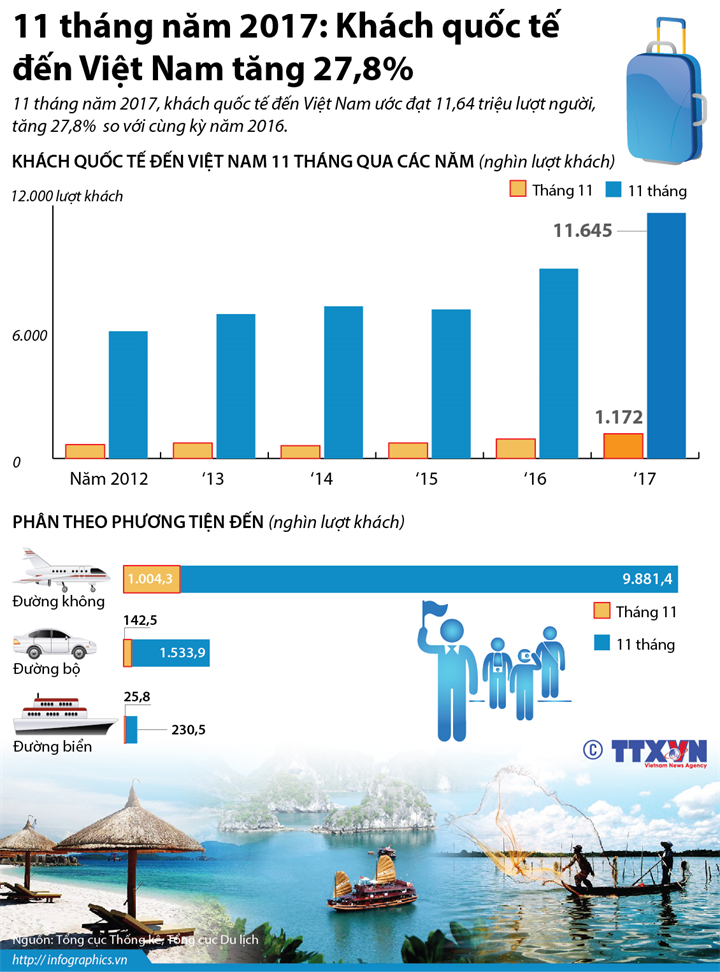 Theo TTXVN Chia sẻ Chia sẻ Tin liên quan [Infographic] Xếp hạng môi trường kinh doanh Việt Nam tăng 14 bậc 03/11/2017 15:18 [Infographic] 10 tháng năm 2017, Việt Nam thu hút 28,24 tỷ USD vốn FDI 28/10/2017 10:33 [Infographic] 10 tháng năm 2017: Khách quốc tế đến Việt Nam tăng 28,1% 02/11/2017 06:31 Từ khóa Infographic khách quốc tế tăng 27 8% tổng cục thống kê tổng cục du lịch