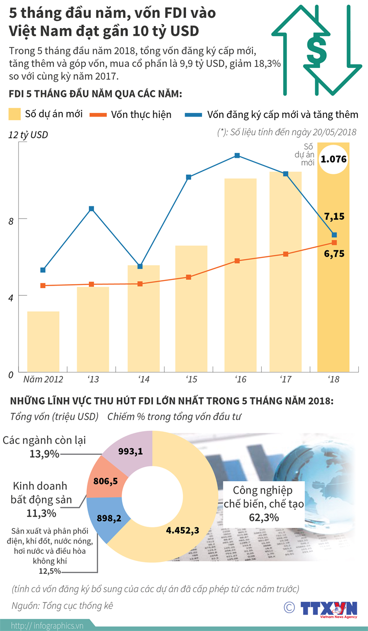 Theo TTXVN Tin liên quan Dự thảo Chiến lược và Định hướng chiến lược thu hút FDI 2018 - 2030: Đón xu hướng để không bỏ lỡ cơ hội đầu tư mới 11/04/2018 11:39 Những lĩnh vực thu hút FDI nhiều nhất 4 tháng đầu năm 28/04/2018 11:46 Chọn lĩnh vực để nói “không” và “có” khi thu hút FDI 16/04/2018 11:07 Trảm một loạt dự án FDI “đi đâu không rõ” 18/05/2018 10:12 Từ khóa infographic infographics infographic kinh tế FDI Thu hút FDI Thu hút vốn FDI đầu tư nhà đầu tư nước ngoài kinh tế - xã hội của Việt Nam