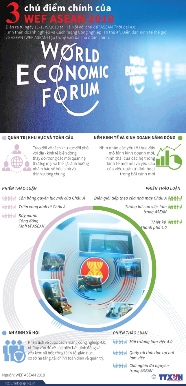 Diễn ra từ ngày 11-13/9/2018 tại Hà Nội với chủ đề “ASEAN Thời đại 4.0: Tinh thần doanh nghiệp và Cách mạng Công nghiệp lần thứ 4”, Diễn đàn Kinh tế thế giới về ASEAN (WEF ASEAN) tập trung vào ba chủ điểm chính.