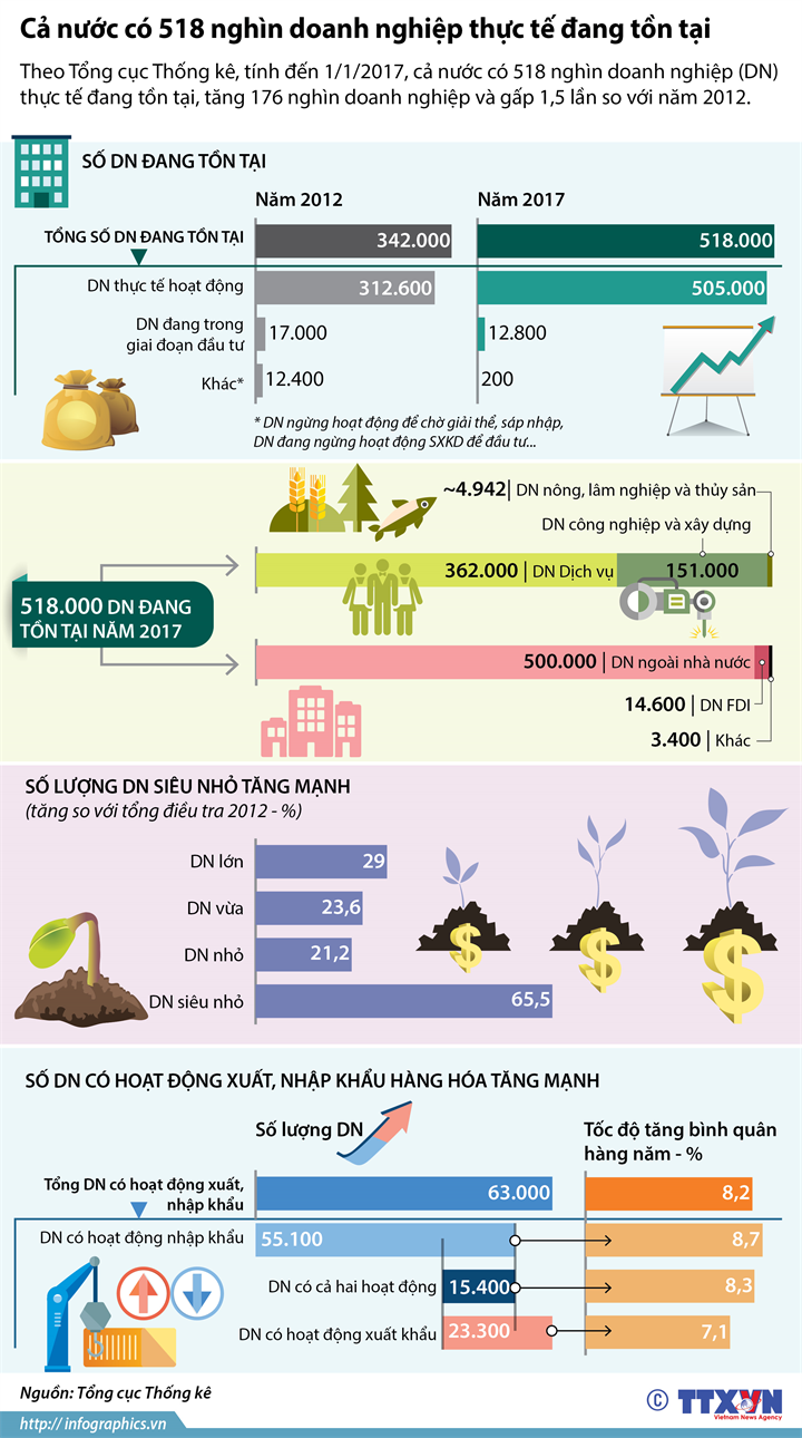 Theo TTXVN Tin liên quan [Infographic] Doanh nghiệp thành lập mới tăng kỷ lục trong 6 năm 01/04/2017 09:37 Nhật Bản rộng cửa mời gọi nhà đầu tư Việt Nam 07/12/2017 11:37 [Infographic] Năm 2017, số doanh nghiệp mới và số vốn đăng ký cao kỷ lục 27/12/2017 15:53 [Infographic] Xếp hạng môi trường kinh doanh Việt Nam tăng 14 bậc 03/11/2017 15:18 Từ khóa Infographic doanh nghiệp Infographic kinh tế số doanh nghiệp hoạt động