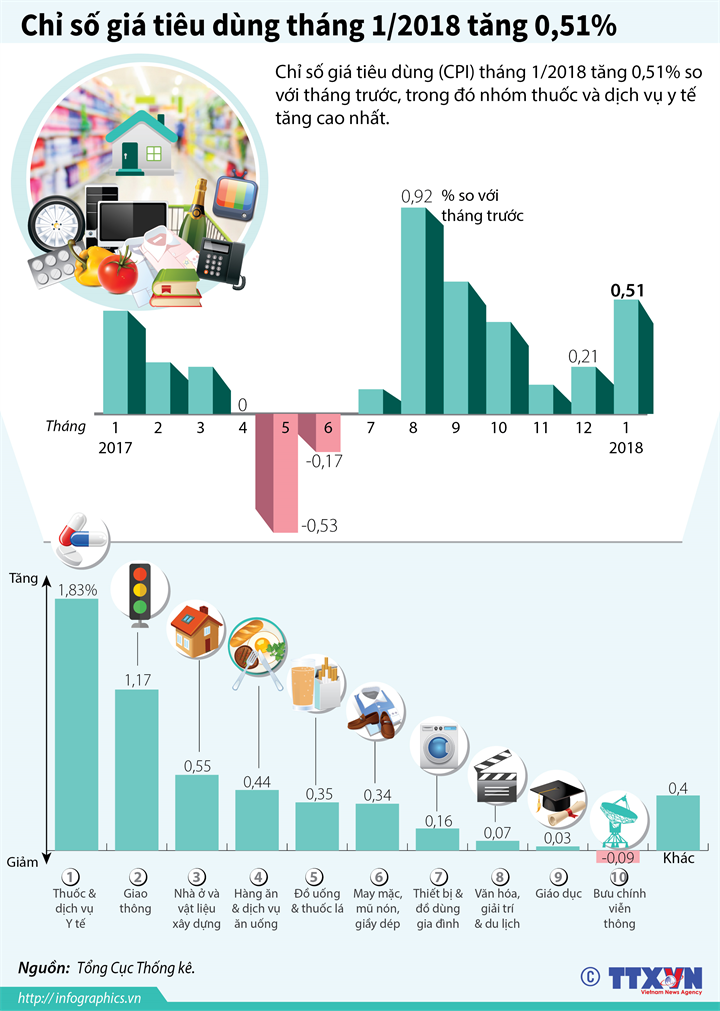 Theo TTXVN Tin liên quan Tháng 11, CPI tăng 0,13%, đưa CPI 11 tháng đầu năm 2017 tăng 3,61% 30/11/2017 11:13 [Infographic] Chỉ số giá tiêu dùng tháng 10/2017 tăng 0,41% 30/10/2017 15:25 CPI tháng 10 tăng 0,41%, lạm phát vẫn trong tầm kiểm soát 29/10/2017 11:55 Chỉ số giá tiêu dùng tháng Bảy tăng 0,11% so với tháng trước 30/07/2017 10:17 Từ khóa Infographic Infographics Infographic kinh tế Infographic chỉ số giá tiêu dùng chỉ số giá tiêu dùng