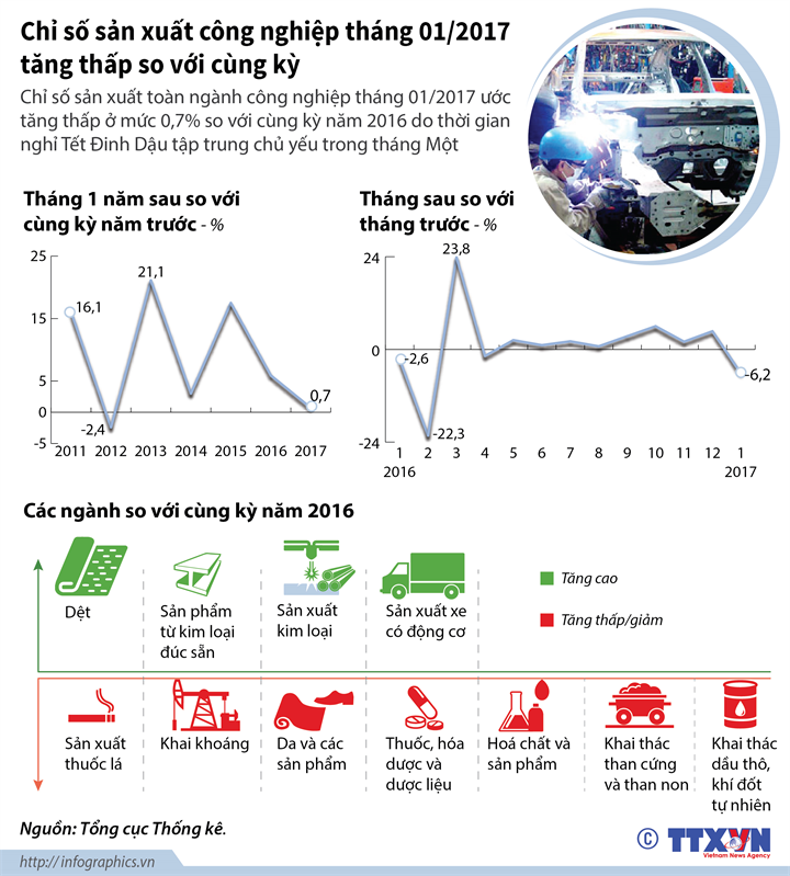 Theo TTXVN Tin liên quan Thêm gần 9.000 doanh nghiệp mới gia nhập thị trường trong tháng đầu năm 2017 04/02/2017 09:51 Sản xuất công nghiệp sẽ tăng cao hơn nhờ giá dầu thô hồi phục 09/06/2016 23:31 “Vướng” hai kỳ Tết, CPI tháng 1/2017 tăng 0,46% 02/02/2017 15:29 Hơn 1,3 tỷ USD vốn FDI vào Việt Nam trong tháng 1 28/01/2016 10:12 Từ khóa công nghiệp infographic Đinh Dậu