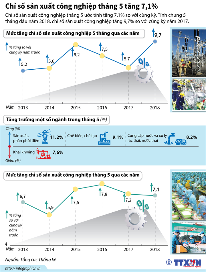 Theo TTXVN Tin liên quan [Infographics] Chỉ số sản xuất công nghiệp tháng 1 tăng 20,9% 30/01/2018 07:07 [Infographic] 11 tháng năm 2017, chỉ số sản xuất công nghiệp tăng 9,3% 29/11/2017 15:11 Công nghiệp 11 tháng tiếp tục đà tăng vững 08/12/2017 06:54 Vĩ mô ổn định sẽ thúc đẩy sự tăng trưởng của doanh nghiệp 28/05/2018 16:00 Từ khóa infographic infographics infographic kinh tế Infographic Chỉ số sản xuất công nghiệp Chỉ số sản xuất công nghiệp tháng 5 Chỉ số sản xuất công nghiệp 2018
