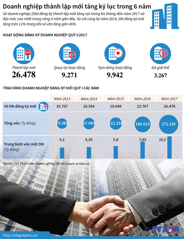 Số doanh nghiệp đăng ký thành lập mới tăng vọt trong ba tháng đầu năm 2017 và đạt mức cao nhất trong vòng 6 năm gần đây. So với cùng kỳ năm 2016, doanh nghiệp đăng ký mới tăng trên 11% trong khi số vốn tăng khoảng 1,5 lần.