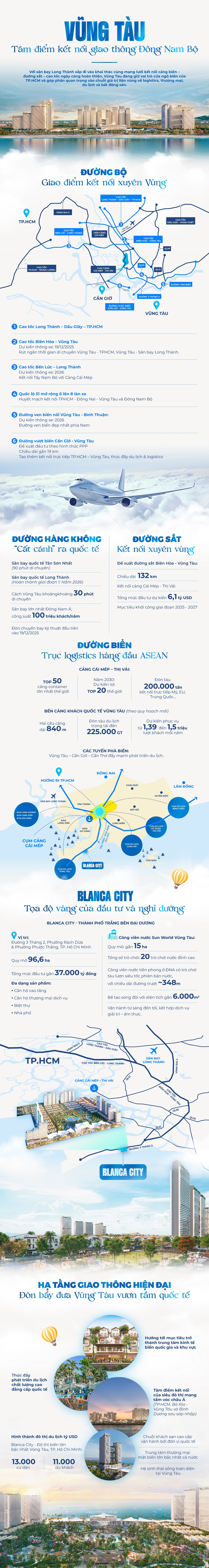 (ĐTCK) Với sân bay Long Thành sắp đi vào khai thác cùng hệ thống giao thông hiện đại “không - thủy - bộ - sắt”, Vũng Tàu đang giữ vai trò cửa ngõ biển của TP.HCM và góp phần quan trọng vào chuỗi giá trị liên vùng về logistics, thương mại, du lịch và bất động sản.