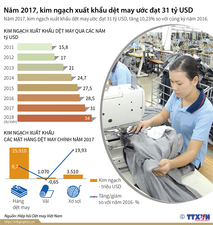 Theo TTXVN Tin liên quan Xuất khẩu dệt may 2017 dự kiến thu về 31 tỷ USD, giày dép - túi xách 18 tỷ USD 29/11/2017 15:55 Hơn 400 đơn vị tham gia triển lãm quốc tế về ngành công nghiệp dệt may lần thứ hai 07/11/2017 16:07 Bộ trưởng Mai Tiến Dũng: 'Cây kim, sợi chỉ phải nhập thì nội địa hoá dệt may thế nào?' 20/06/2017 14:04 Năm 2017, thặng dư thương mại dệt may đạt 15,5 tỷ USD 06/12/2017 15:53 Từ khóa xuất khẩu dệt may kim ngạch Infographic hàng dệt may vải xơ sợi