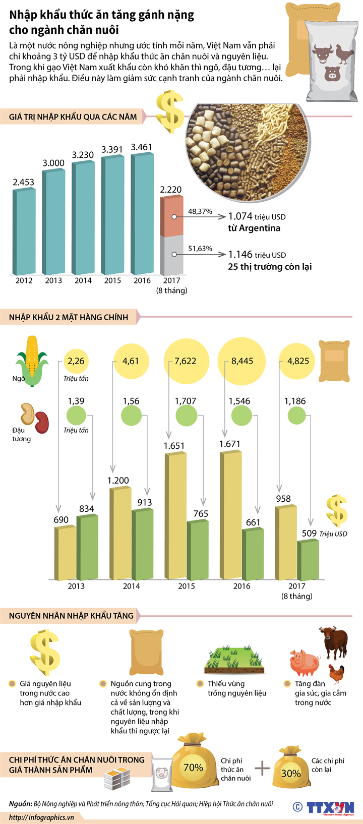 [Infographic] Nhập khẩu thức ăn tăng gánh nặng cho ngành chăn nuôi