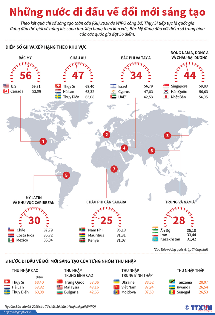 Theo kết quả chỉ số sáng tạo toàn cầu (GII) 2018 do WIPO công bố, Thụy Sĩ tiếp tục là quốc gia đứng đầu thế giới về năng lực sáng tạo. Xếp hạng theo khu vực, Bắc Mỹ đứng đầu với điểm số trung bình của các quốc gia đạt 56 điểm.