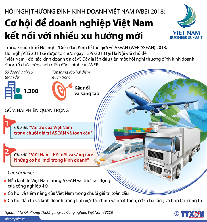 Trong khuôn khổ Hội nghị “Diễn đàn Kinh tế thế giới về ASEAN (WEF ASEAN) 2018, Hội nghị VBS 2018 sẽ được tổ chức ngày 13/9/2018 tại Hà Nội với chủ đề “Việt Nam - đối tác kinh doanh tin cậy”.Đây là lần đầu tiên một hội nghị thượng đỉnh kinh doanh được tổ chức bên cạnh diễn đàn chính của WEF.
