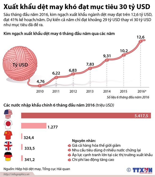 Theo TTXVN Tin liên quan Đề xuất quy hoạch khu công nghiệp dệt may lên tới 1.000 ha 13/07/2016 10:00 Rắc rối đại hội lần đầu của Dệt may Gia Định 20/07/2016 10:44 Thiết bị dệt may Đức tìm đường đến Việt Nam 18/07/2016 15:44 Từ khóa xuất khẩu dệt may kim ngạch xuất khẩu mục tiêu đề ra infographic