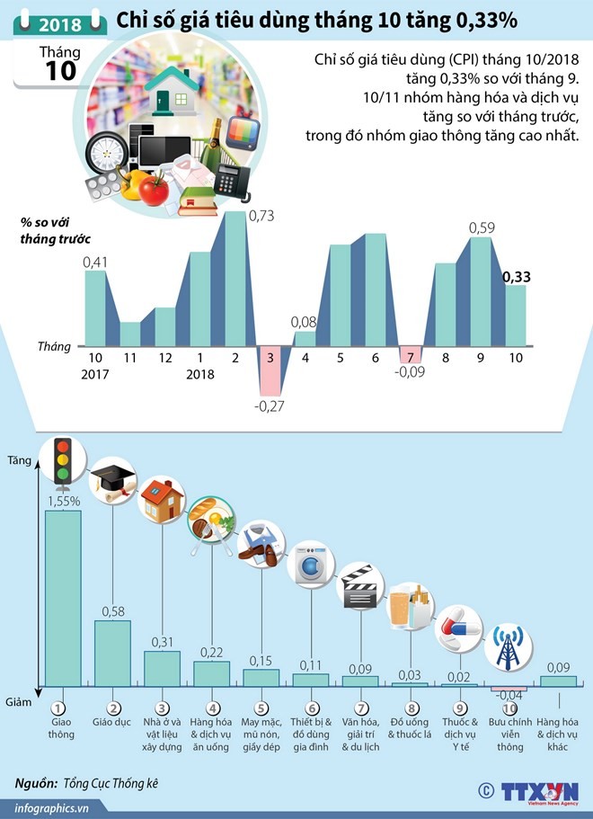 Theo TTXVN Tin liên quan CPI Hà Nội tháng 10 tăng nhẹ do 2 lần điều chỉnh giá xăng 26/10/2018 15:38 GDP vượt chỉ tiêu nhưng chưa bền vững, cần giải pháp tích cực cho năm 2019 27/10/2018 10:18 [Infographic] Chỉ số giá tiêu dùng tháng 7 giảm nhẹ 02/08/2018 10:50 CPI 8 tháng tăng 3,52% so với cùng kỳ năm 2017 30/08/2018 10:01 Từ khóa CPI Chỉ số giá tiêu dùng Infographics nhóm giao thông