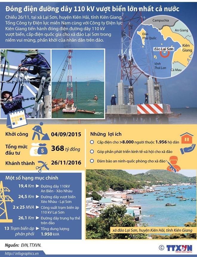 Chiều 26/11, tại xã Lại Sơn, huyện Kiên Hải, tỉnh Kiên Giang, Tổng Công ty Điện lực miền Nam cùng với Công ty Điện lực Kiên Giang tiến hành đóng điện đường dây 110 kV vượt biển, cấp điện quốc gia cho xã đảo Lại Sơn trong niềm vui mừng, phấn khởi của nhân dân trên đảo.