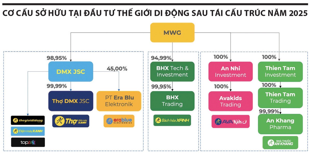 Điện Máy Xanh hiện là một trong những trụ cột quan trọng của Công ty cổ phần Đầu tư Thế giới Di động (mã MWG), cùng với các chuỗi Thế Giới Di Động, TopZone, Erablue và Thợ Điện Máy Xanh. Tính đến cuối tháng 3/2026, tổng số cửa hàng của hệ sinh thái này đạt 3.232 điểm bán, trong đó riêng chuỗi Điện Máy Xanh chiếm 2.006 cửa hàng, tiếp tục giữ vị thế dẫn đầu thị trường.
