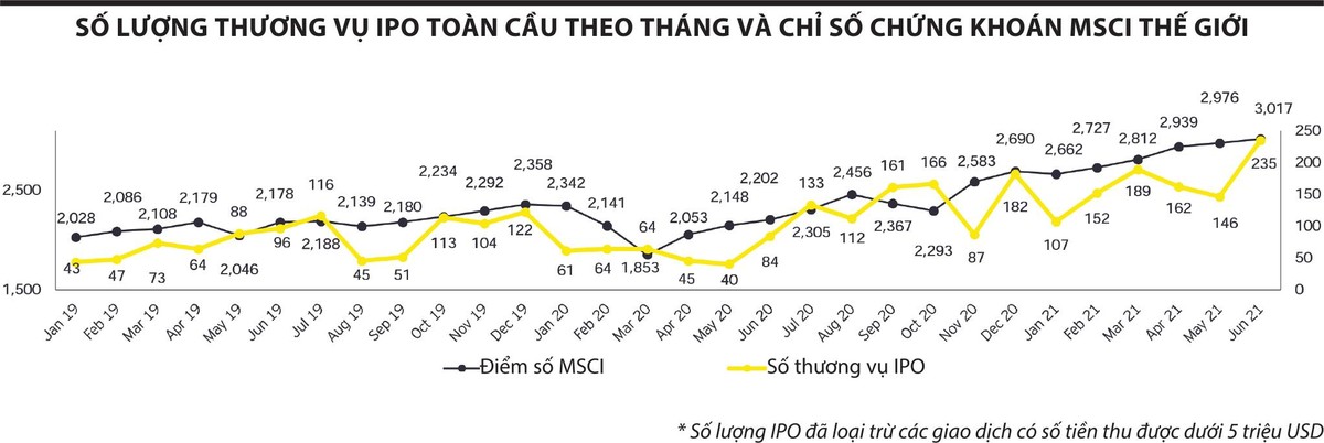 Trong quý II/2021 có 597 thương vụ IPO thu hút 111,6 tỷ USD, là quý có các thương vụ IPO sôi động nhất trong vòng 20 năm qua, đánh bại kỷ lục được xác lập vào năm 2007 với 522 thương vụ trị giá 87,7 tỷ USD.