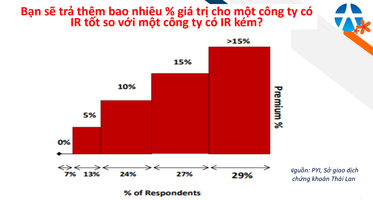 Theo ông Mathew Smith, nhà đầu tư đánh giá cao các công ty minh bạch thông tin và sẵn sàng trả một mức giá cao hơn cho các doanh nghiệp có hoạt động IR xuất sắc. Với công ty có hoạt động IR tốt, 56% nhà đầu tư tham gia khảo sát chấp nhận trả mức giá cao hơn ít nhất 15% so với công ty tương tự nhưng có hoạt động IR kém. Khoảng 24% nhà đầu tư tham gia chịu trả cao hơn 10%.