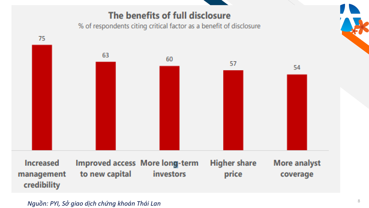 Phần lớn nhà đầu tư tham gia khảo sát cho rằng minh bạch thông tin sẽ tăng uy tín của ban quản lý (75%), cải thiện khả năng tiếp cận vốn mới (63%), thu hút nhà đầu tư dài hạn (60%) và được nhiều chuyên viên phân tích chú ý hơn (54%).