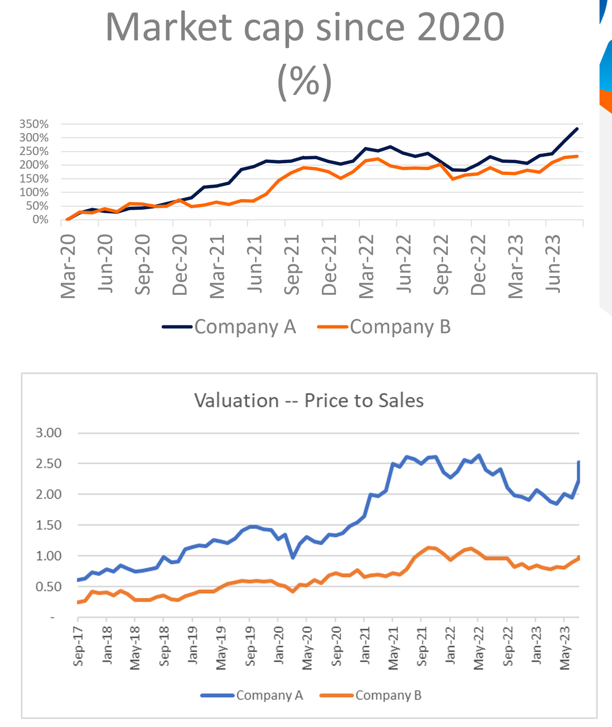 So sánh diễn biến cổ phiếu của hai doanh nghiệp Việt Nam, trong đó công ty A là một công ty bluechip có hoạt động kinh doanh vững mạnh và IR tốt, còn B là công ty cùng ngành. Kết quả cho thấy với hoạt động IR tốt hơn, công ty A có vốn hóa thị trường cao hơn, thanh khoản tốt hơn và định giá P/sales cũng cao hơn nhiều.