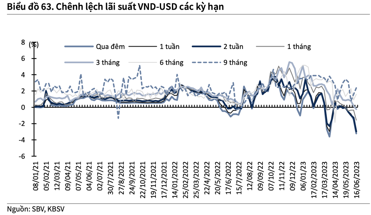 Thứ nhất, mới đây, Bộ Kế hoạch và Đầu tư đã cập nhật kịch bản tăng trưởng kinh tế cả năm 2023 sau khi GDP 6 tháng ước chỉ đạt 3,72%, thấp hơn so với kịch bản đã đề ra. Dù vậy, Chính Phủ vẫn chưa có ý định thay đổi mục tiêu GDP năm nay, đồng nghĩa với việc để đạt được mức tăng trưởng 6 - 6,5% thì cần có những biện pháp quyết liệt hơn nữa từ phía nhà hoạch định chính sách. Vì vậy, với ưu tiên hàng đầu là duy trì tăng trưởng kinh tế, KBSV cho rằng NHNN sẽ tiếp tục hạ lãi suất điều hành nếu không có biến động bất thường về tỷ giá.