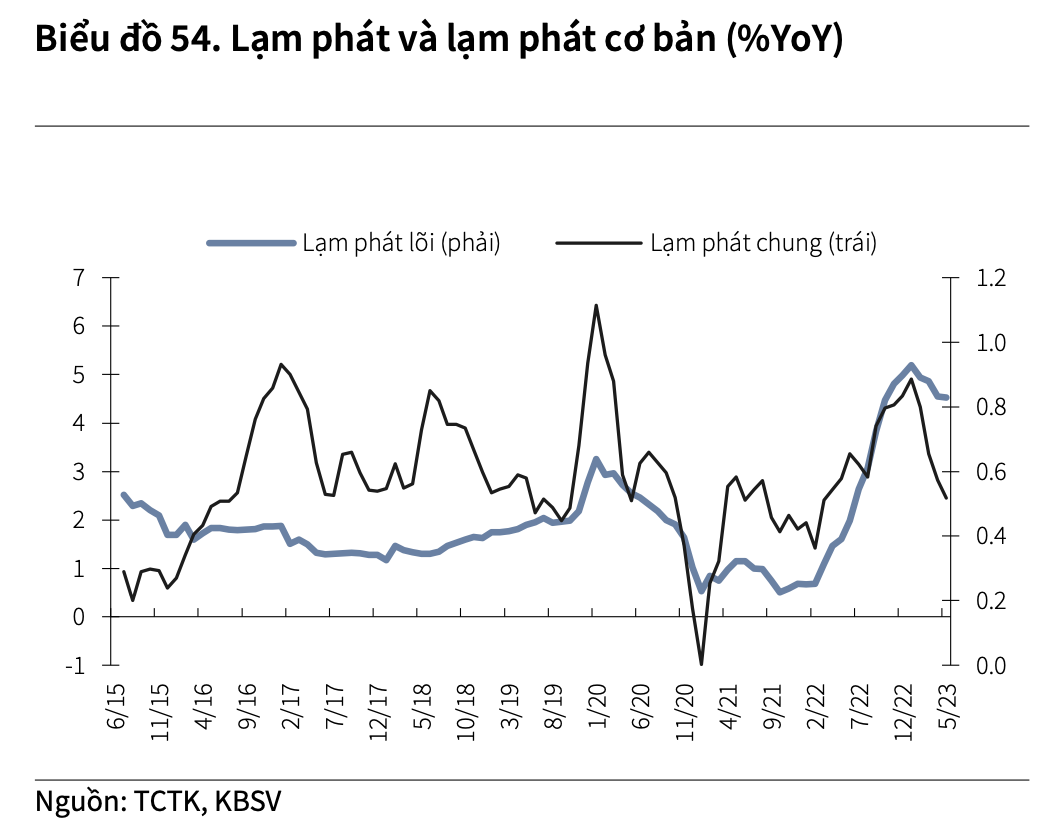 Một số dấu hiệu cho thấy lạm phát sẽ tăng trở lại trong 6 tháng cuối năm. Mặc dù vậy, với mức tăng rất thấp trong 6 tháng đầu năm (tăng 0,7% từ đầu năm, bình quân 0,1% so với tháng trước), KBSV kỳ vọng lạm phát cả năm 2023 vẫn sẽ được kiểm soát ở mức thấp hơn hẳn so với mục tiêu Chính phủ đề ra. Cụ thể, lạm phát 2023 cả năm dự báo tăng 2,8% so với cùng kỳ, với mức tăng bình quân mỗi tháng trong nửa cuối năm là 0,35% so với tháng trước.
