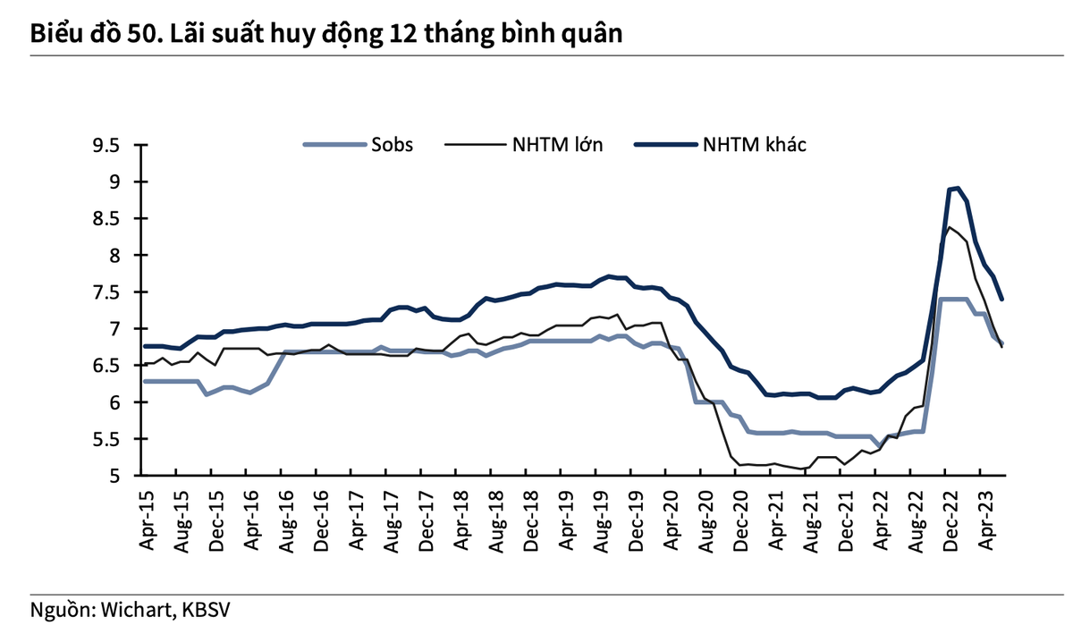 KBSV dự báo, lãi suất huy động sẽ tiếp tục xu hướng giảm từ nay đến cuối năm, với mức lãi suất huy động bình quân 12 tháng của các ngân hàng quanh mức 6,2% (giảm 1,8% so với đầu năm, và giảm 0,45% so với thời điểm hiện tại).