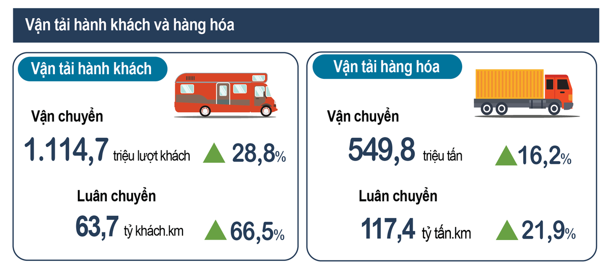 Hoạt động vận tải duy trì đà tăng trưởng tích cực cả về vận tải hành khách và hàng hóa. Vận tải hành khách quý I/2023 đạt 1.114,7 triệu lượt khách vận chuyển, tăng 28,8% so với cùng kỳ năm trước (cùng kỳ năm 2022 giảm 10,7%) và luân chuyển đạt 63,7 tỷ lượt khách.km, tăng 66,5% (cùng kỳ năm trước giảm 7,2%). Vận tải hàng hóa quý I đạt 549,8 triệu tấn hàng hóa vận chuyển, tăng 16,2% so với cùng kỳ năm trước (cùng kỳ năm 2022 tăng 2%) và luân chuyển 117,4 tỷ tấn.km, tăng 21,9% (cùng kỳ năm trước tăng 11,1%).