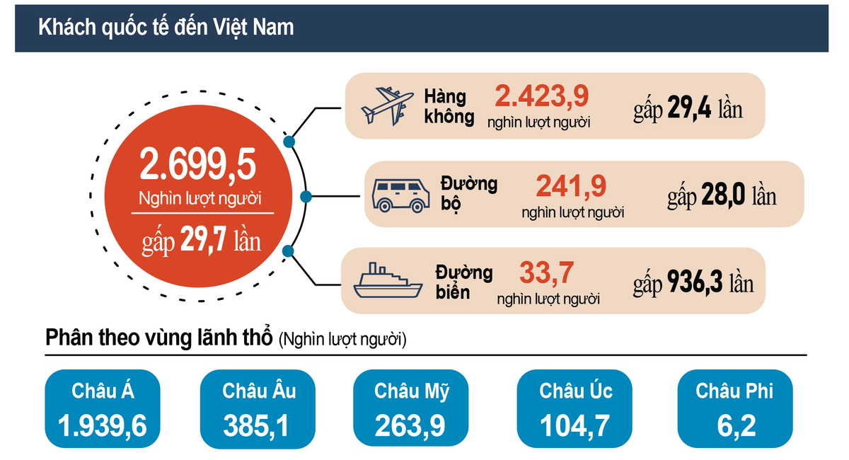 Trong đó, khách đến bằng đường hàng không đạt 2.423,9 nghìn lượt người, chiếm 89,8% lượng khách quốc tế đến Việt Nam và gấp 29,4 lần cùng kỳ năm trước; bằng đường bộ đạt 241,9 nghìn lượt người, chiếm 9% và gấp 28 lần; bằng đường biển đạt 33,7 nghìn lượt người, chiếm 1,2% và gấp 936,3 lần.