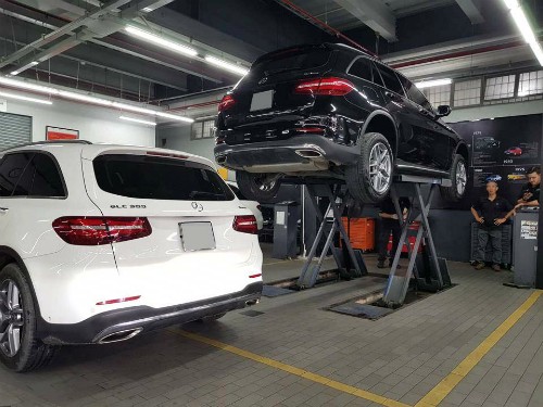 Hai mẫu GLC kiểm tra dầu vi sai tại một đại lý Mercedes ở TP HCM.