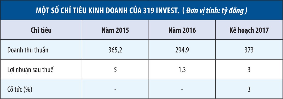 Báo cáo tài chính của 319 Invest cho biết, năm 2016, doanh thu của Công ty đạt 295 tỷ đồng, giảm 19,1% so với năm 2015. Doanh thu giảm, nhưng chi phí lại tăng. Cụ thể, chi phí lãi vay năm 2016 là 10,4 tỷ đồng, tăng 2,7% và chi phí quản lý doanh nghiệp 15,4 tỷ đồng, tăng 8,9% khiến lợi nhuận sau thuế giảm mạnh xuống 1,3 tỷ đồng. Tỷ suất lợi nhuận sau thuế/doanh thu chỉ đạt 0,44% (năm 2015 đạt 1,36%).