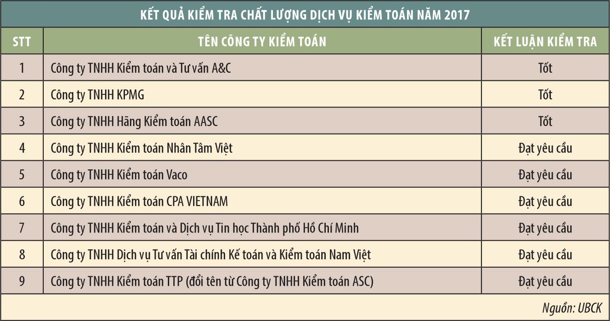 Để kịp thời xử lý sớm các vi phạm phát sinh, trong năm 2017, UBCK chủ trì phối hợp với Vụ Chế độ Kế toán và Kiểm toán (Bộ Tài chính), Hội Kiểm toán viên hành nghề Việt Nam (VACPA) và kiểm toán viên hành nghề tại các công ty kiểm toán tổ chức kiểm tra trực tiếp chất lượng dịch vụ kiểm toán năm 2017 tại 9 doanh nghiệp kiểm toán được chấp thuận kiểm toán cho các đơn vị có lợi ích công chúng thuộc lĩnh vực chứng khoán gồm: Công ty TNHH Kiểm toán và Tư vấn A&C, Công ty TNHH KPMG, Công ty TNHH Kiểm toán CPA VIETNAM, Công ty TNHH Hãng Kiểm toán AASC... (xem bảng chi tiết).