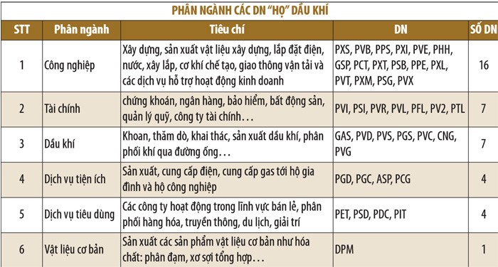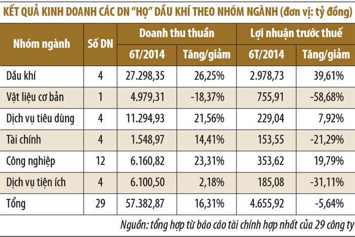 Tham khảo tiêu chí phân ngành của CTCK Dầu khí (PSI), các DN dầu khí được phân thành 6 nhóm ngành là công nghiệp, tài chính, dầu khí, dịch vụ tiện ích, dịch vụ tiêu dùng và vật liệu cơ bản. Trong đó, 29 DN đã công bố BCTC hợp nhất, tính cả BCTC của những DN không có đơn vị thành viên và liên kết. Doanh thu hợp nhất của 29 DN này đạt 57.383 tỷ đồng trong 6 tháng đầu năm, tăng 16,3%; lợi nhuận đạt 4.656 tỷ đồng, giảm 5,64% so với cùng kỳ năm ngoái.