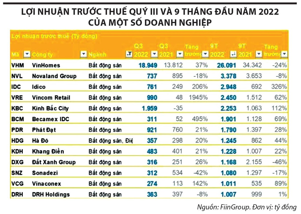 Cụ thể, lũy kế 9 tháng đầu năm 2022, có 13 doanh nghiệp bất động sản đạt lợi nhuận trước thuế trên 1.000 tỷ đồng, cao hơn con số 10 doanh nghiệp của cùng kỳ năm trước. Tuy nhiên, tới phân nửa trong đó ghi nhận lợi nhuận tăng trưởng nhờ hoạt động tài chính với giá trị từ vài trăm tới cả nghìn tỷ đồng.