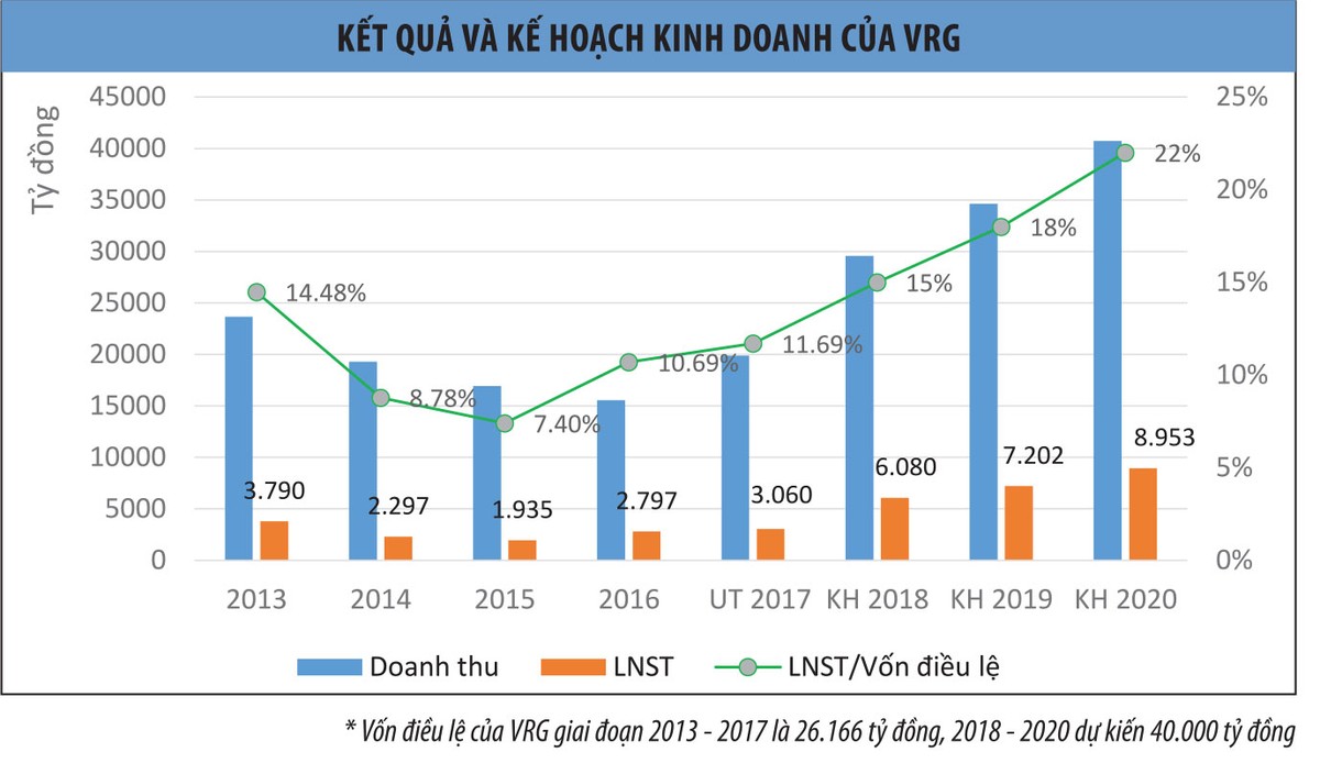 Giả định VRG duy trì hiệu quả kinh doanh như nửa đầu năm 2017 và lợi nhuận sau thuế cả năm đạt 3.060 tỷ đồng, thì chỉ số lợi nhuận trên tổng tài sản (ROA) và lợi nhuận trên vốn chủ sở hữu (ROE) năm 2017 lần lượt là 4,25% và 7,65%.
