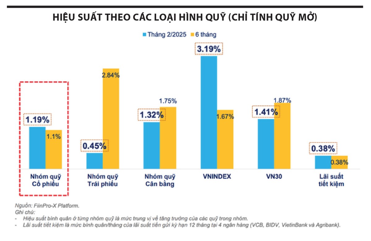 Một trong những lý do quỹ trái phiếu hút ròng chính là hiệu suất đầu tư tích cực. Trong tháng 2/2025, nhóm quỹ cổ phiếu và quỹ cân bằng ghi nhận mức sinh lời lần lượt là 1,19% và 1,32%, cao hơn so với nhóm quỹ trái phiếu (với 0,45%). Tuy nhiên, trong tháng 1/2025, quỹ trái phiếu là nhóm duy nhất duy trì cho mức sinh lời dương. Xét trên khung thời gian dài hơn, trong 6 tháng gần nhất, nhóm quỹ trái phiếu vẫn duy trì mức hiệu suất vượt trội so với nhóm quỹ cổ phiếu và quỹ cân bằng, phản ánh sự ổn định của chiến lược đầu tư thu nhập cố định trong giai đoạn thị trường cổ phiếu đi ngang như giai đoạn vừa qua.