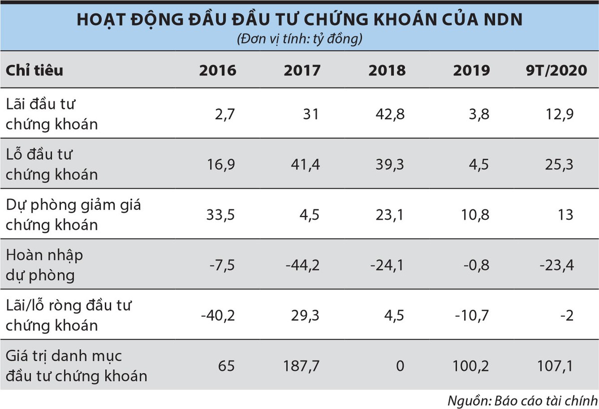Xa hơn, từ năm 2016 tới nay, mặc dù liên tục duy trì danh mục đầu tư vào cổ phiếu cơ bản nhưng hiệu quả mảng kinh doanh chứng khoán của NDN cũng không đều. Năm 2016, Công ty lỗ 40,2 tỷ đồng, năm 2017 lãi 29,3 tỷ đồng, năm 2018 lãi 4,5 tỷ đồng, năm 2019 lỗ 10,7 tỷ đồng.