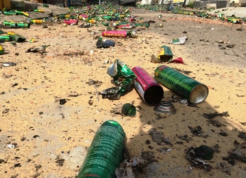 Nhiều chai thuốc xịt côn trùng biến dạng sau vụ cháy. Ảnh: Thạch Thảo.
