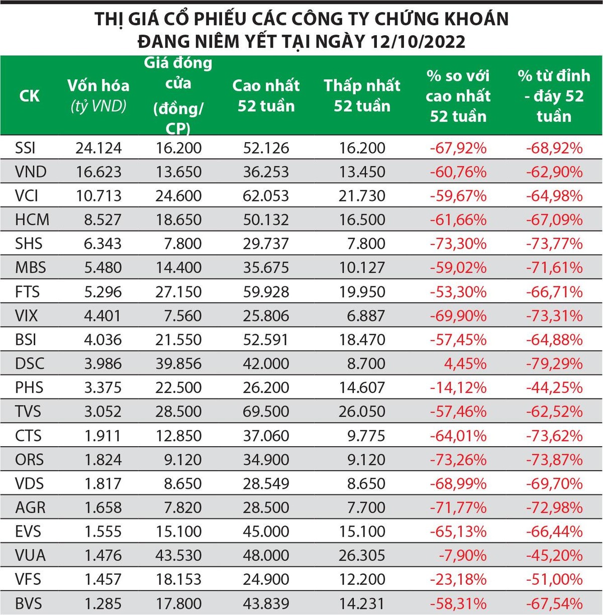 Nếu so với vùng đỉnh, nhiều mã mất 60 - 80% giá trị (xem bảng thống kê), mức giảm này thậm chí còn lớn hơn mức suy giảm khi thị trường tạo đáy giai đoạn đại dịch Covid-19 mới bùng phát. Theo Công ty Chứng khoán Agribank (Agriseco), nhóm cổ phiếu chứng khoán có độ biến động (beta) rất cao và gắn liền với diễn biến thị trường chứng khoán, vì diễn biến thị trường ảnh hưởng trực tiếp tới hoạt động kinh doanh trong kỳ. Thị trường chứng khoán giai đoạn vừa qua giảm mạnh cả về thanh khoản và điểm số nên thị giá nhóm này giảm sâu là phù hợp logic.