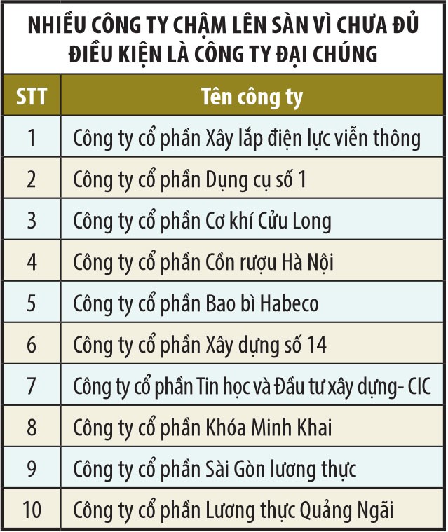 Đáng chú ý, trong số hơn 500 công ty được Văn phòng Chính phủ nêu tên, có rất nhiều doanh nghiệp đưa ra lý do chưa lên sàn vì chưa đủ điều kiện là công ty đại chúng (cổ phiếu được ít nhất 100 nhà đầu tư sở hữu, không kể nhà đầu tư chứng khoán chuyên nghiệp và có vốn điều lệ đã góp từ 10 tỷ đồng trở lên).